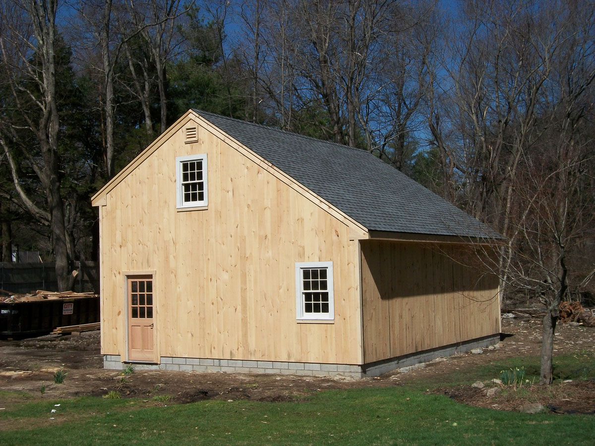 The Broken Back Salt Box timber frame barn features a symmetrical main section paired with an attached shed along the eave wall. The steeper roofline of the main section contrasts with the shed’s gentler pitch, creating both visual interest and additional functional space.