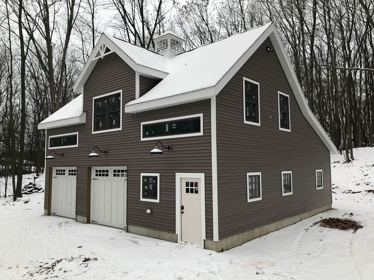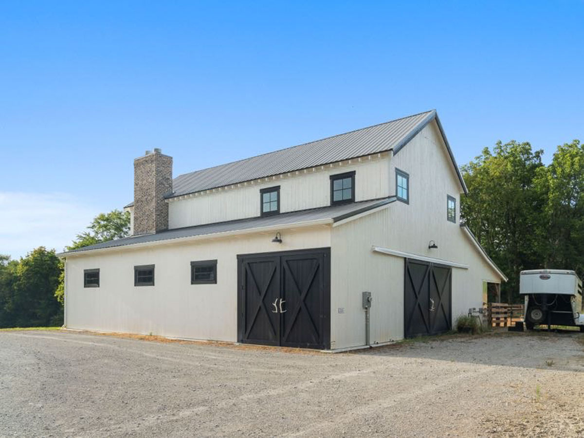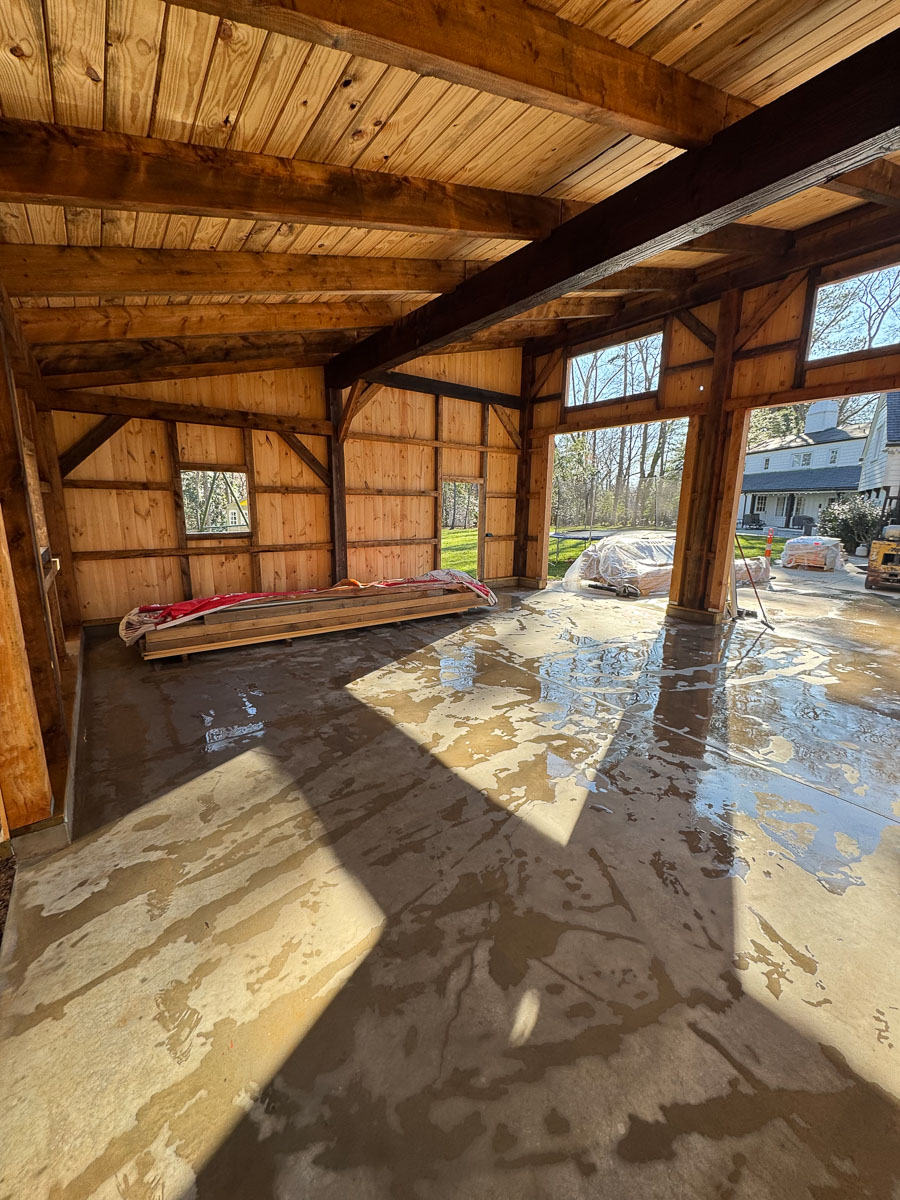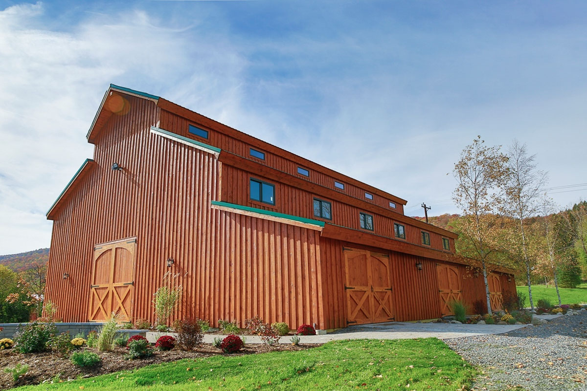 The Colonial style timber frame barn has a symmetrical roofline to not only provide a consistent interior height but also to create a balanced exterior, elevating both function and aesthetic appeal.