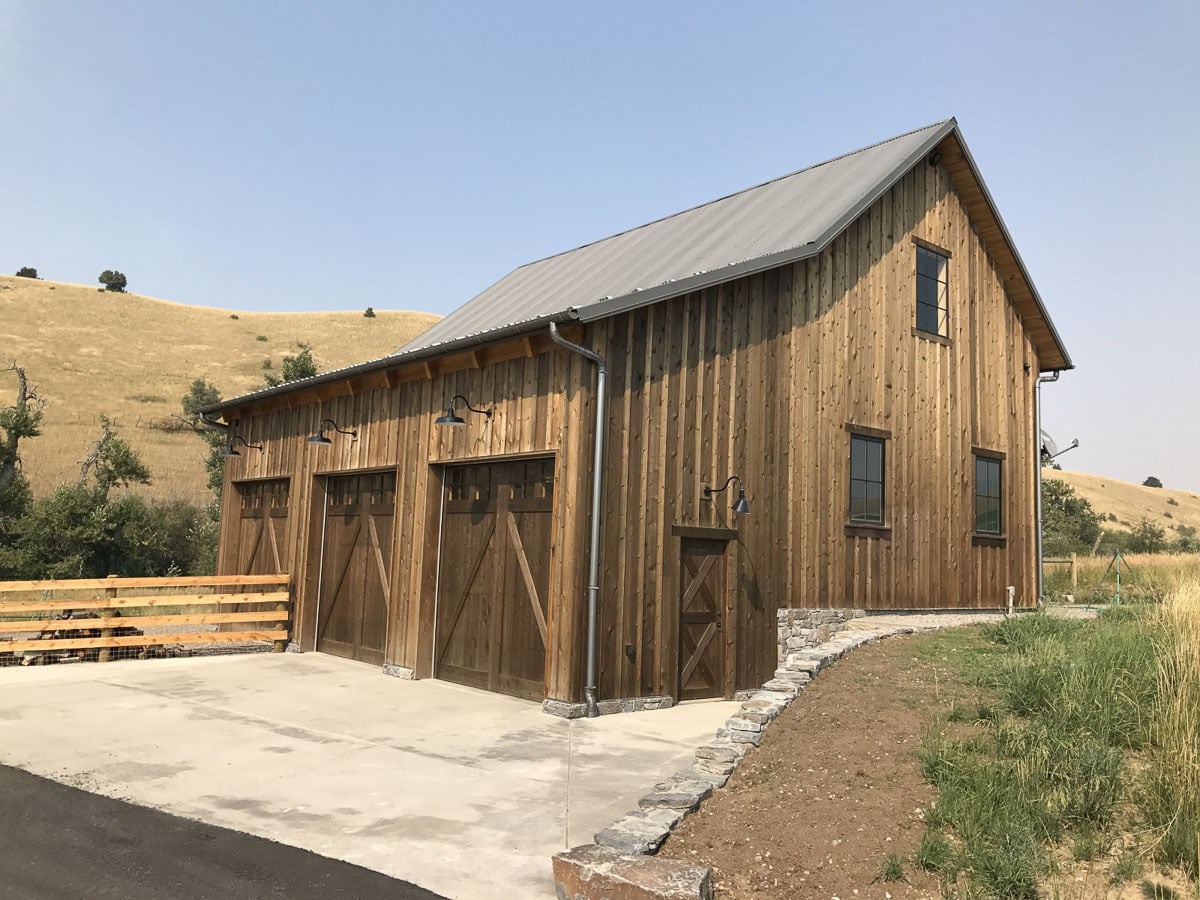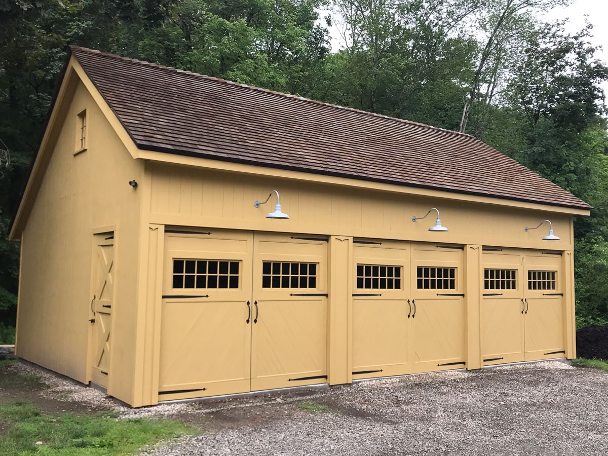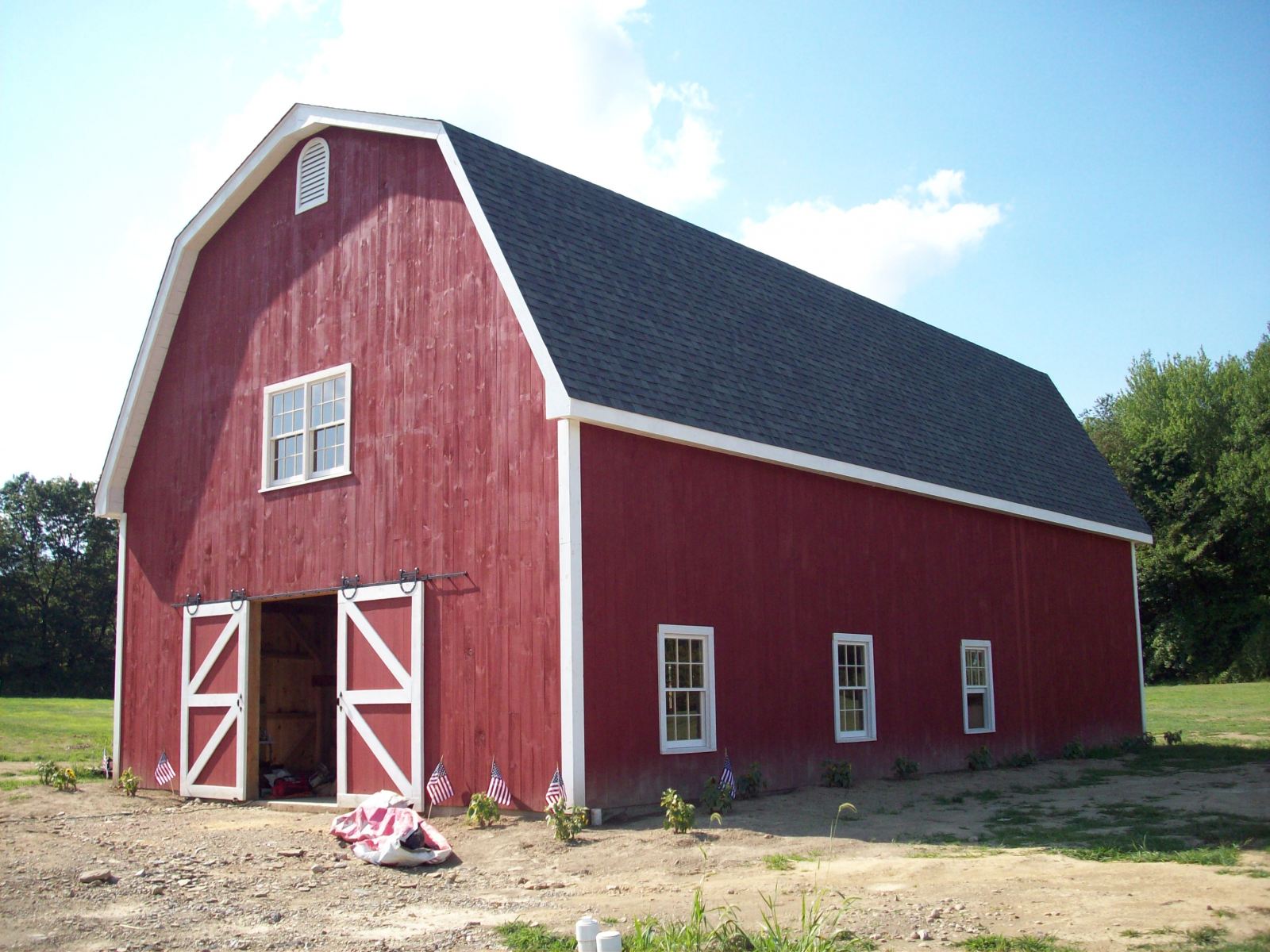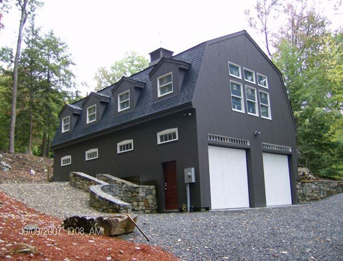 Gambrel timber frame barn has a symmetrical roof with dual slopes on each side. The gentle upper slope maximizes headroom, while the steeper, lower slope creates a fully functional second story ideal for extra storage or versatile use.