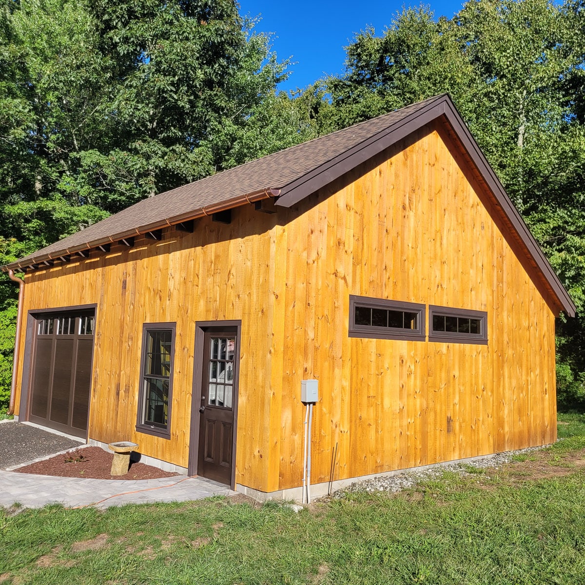 A salt box timber frame barn features its signature asymmetrical roofline—long and sloping in the back, shorter in the front—creating a classic New England silhouette. Originally designed to help colonial families avoid additional taxation on two-story structures, this clever style combines historic charm with practical extra space, making it a timeless and functional choice for storage, workshops, or living areas.