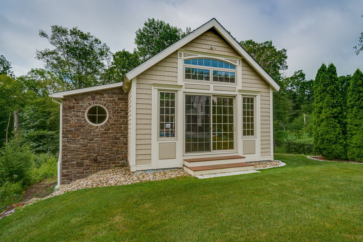 The Broken Back Salt Box timber frame barn pairs a Colonial series building with a lean-to attached to the eave wall that can be enclosed or open-air. The steeper roofline of the main section contrasts with the shed’s gentler pitch, creating both visual interest and additional functional space.