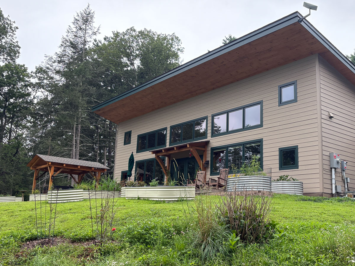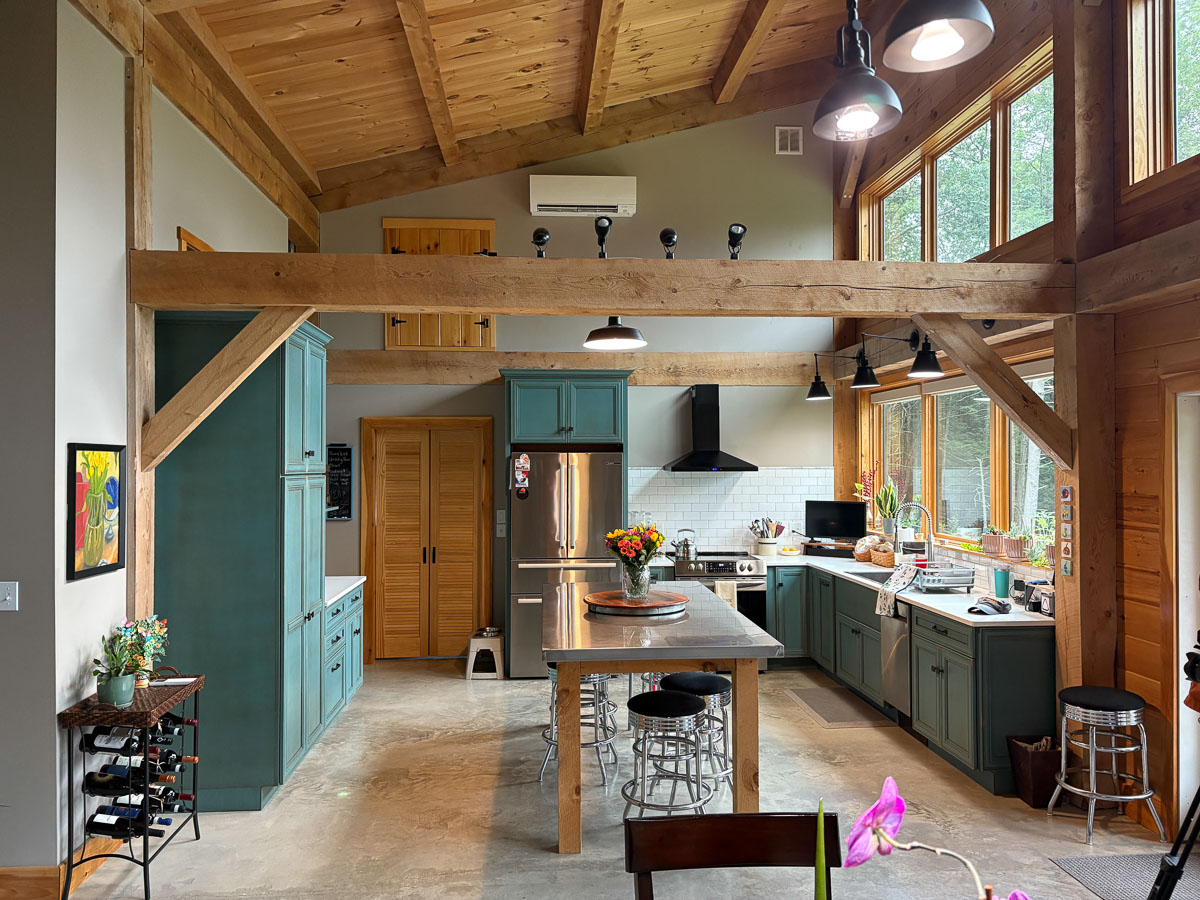 Monitor style timber frame barn showcases a spacious central aisle that rises above the adjoining roofs, allowing for a wall that can be fitted with windows to flood the interior with natural light.