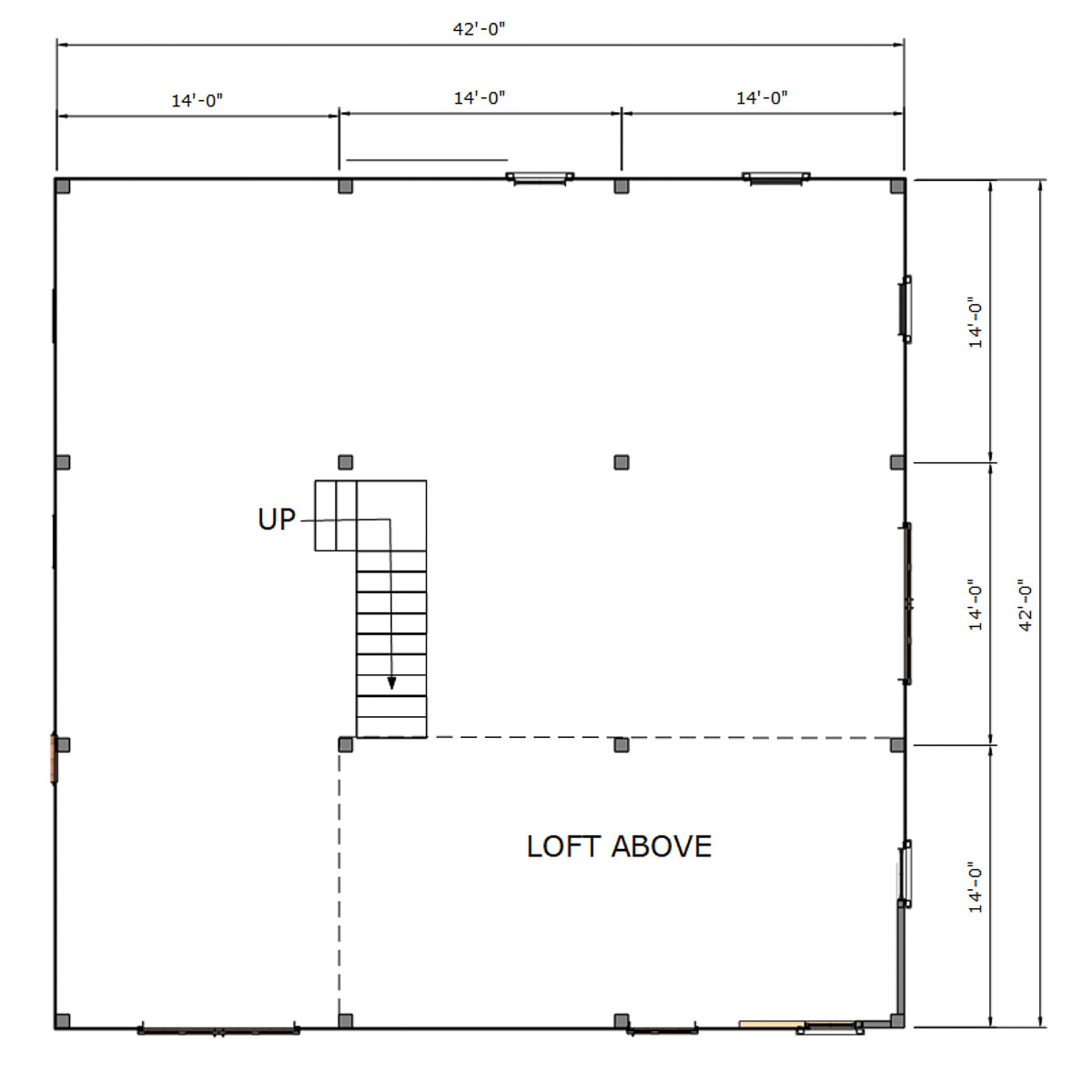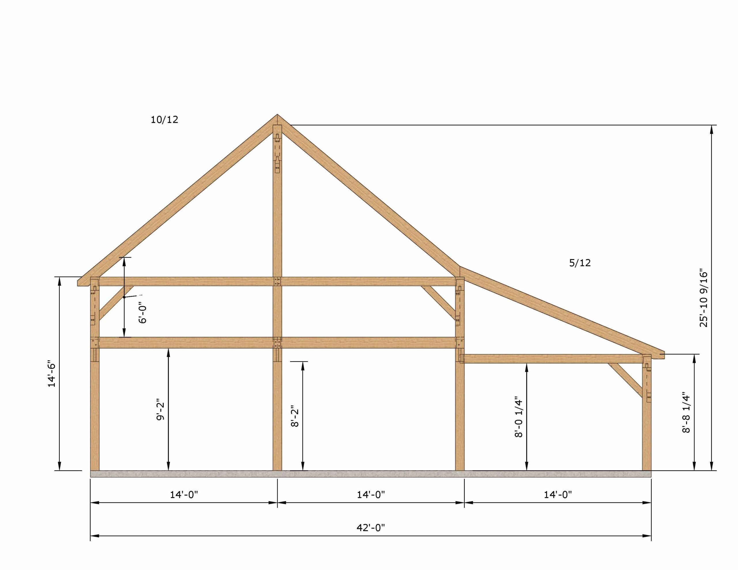 This Broken Back Salt Box in the 42×42-foot configuration offers an impressive blend of spacious design and timeless character. This model features a 28×14 loft above—perfect for storage, an office, or a quiet retreat—paired with a stunning 28×28 open cathedral area that showcases the dramatic height and craftsmanship of exposed timber framing.