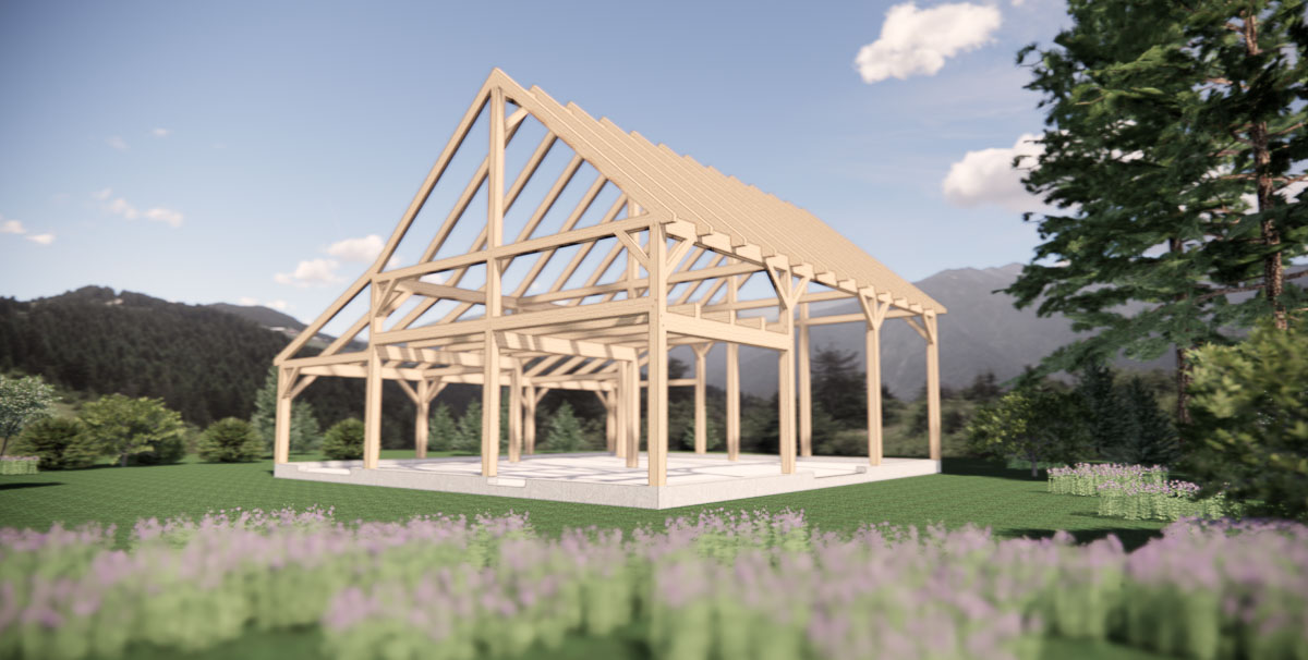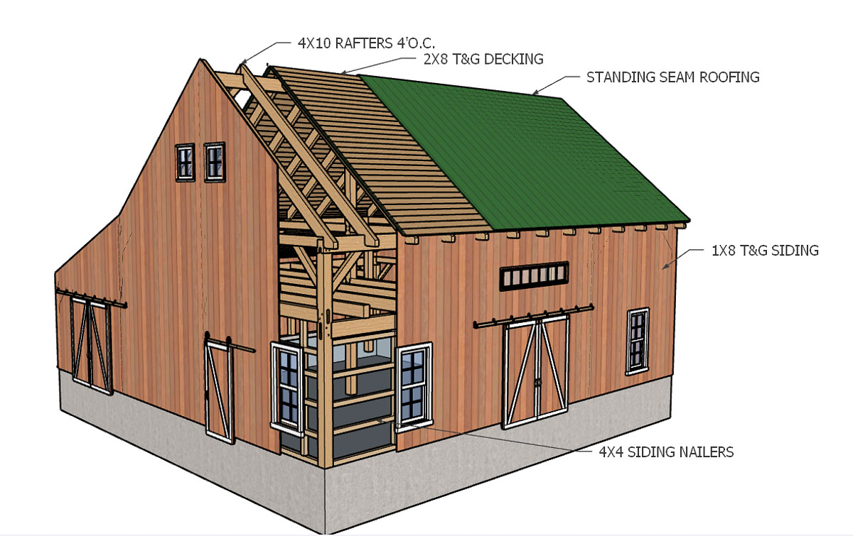 - Bent rafters / typically 8×12’s at each post location with 6×8 or 6×10 cross purlins