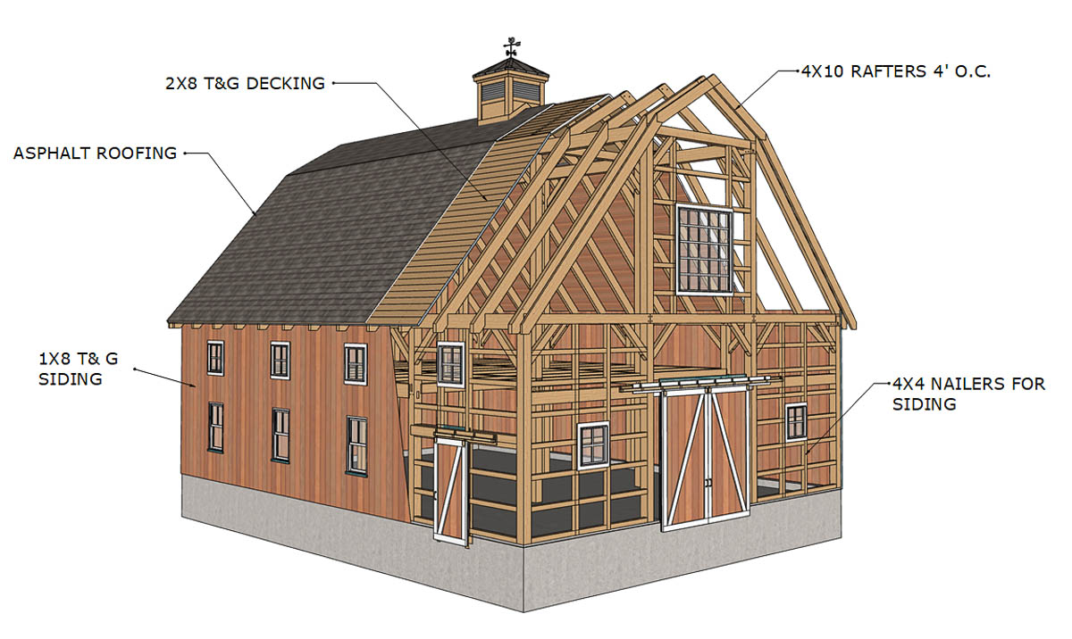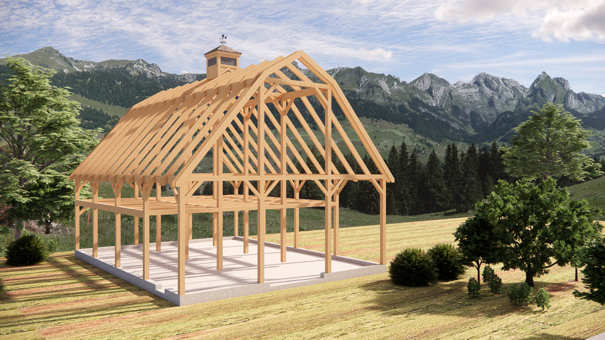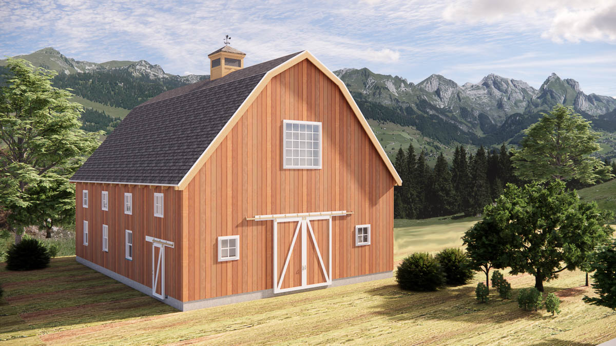 This Gambrel timber frame barn kit blends classic barn style with modern functionality, making it a favorite for those who appreciate both beauty and practicality. With its 36×48-foot footprint, this model provides ample room for vehicles, equipment, or creative use of space. This model is shown with a 36×36 loft—about 75% of the floor area—leaving a striking 36×12 cathedral area that showcases the open expanse of timber framing and floods the interior with natural light.
